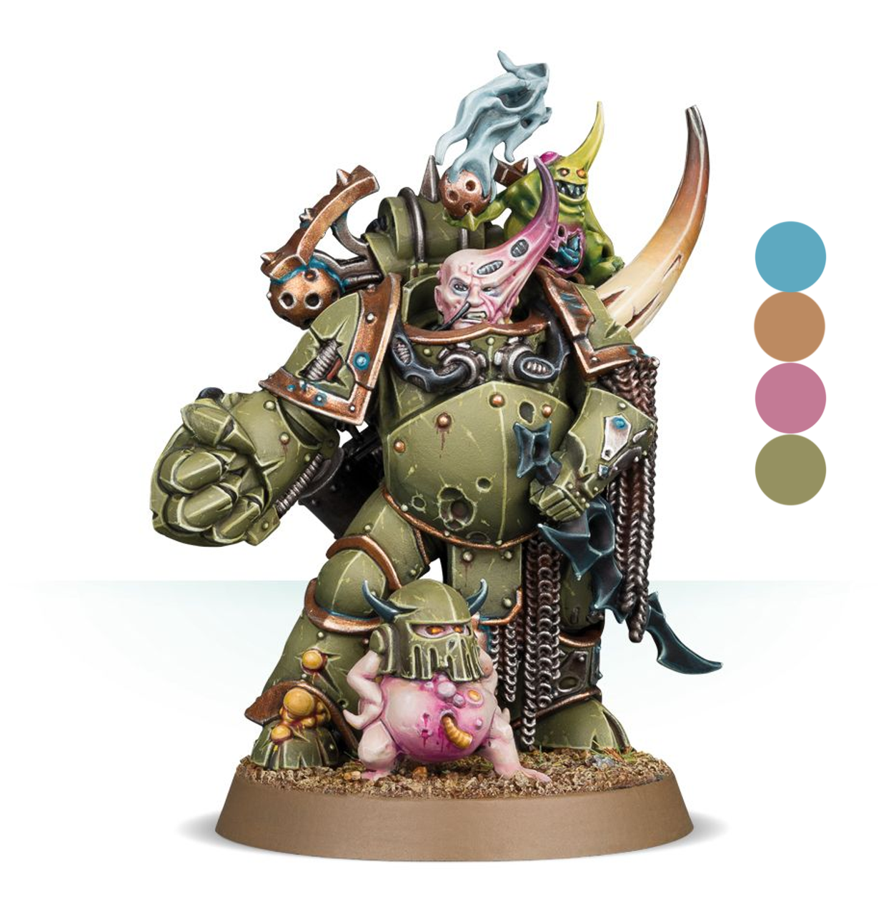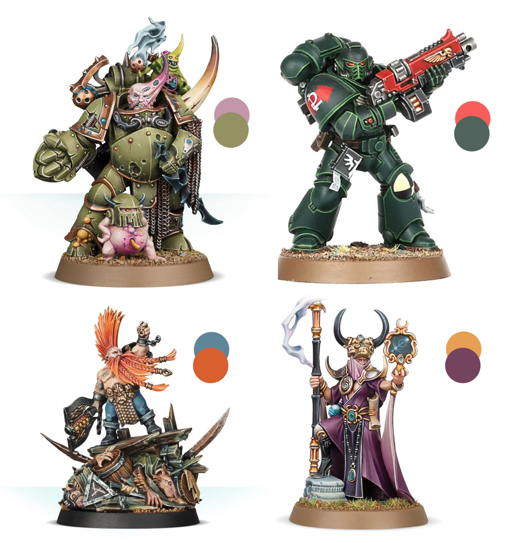If we go back and look again at our Plague Marine from earlier, we'll find that there's a second complimentary pair hiding in plain sight. The gold and verdigris together create a subtle complimentary pair, making this scheme tetradic instead of simply complimentary. You see how ridiculous this can get?