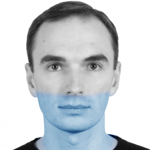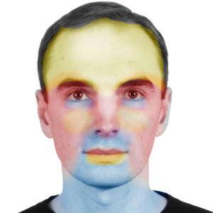 So we take our simple map and make some tweaks. To start with, the nose of the bridge is desaturated slightly, along with the upper part of the forehead. The reddish blush tone is extended down the cheeks and applied to the lips, as well as a bit of the eyebrow-area. The blue tone is added to the under-eye area and the area under the nostrils. Some yellow is added to the tops of the cheeks and the labii inferioris underneath the mouth. Obviously this is very exaggerated, but our model is looking more... realistic in where the colours are placed on his face.