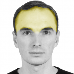 The first of these zones is the forehead; that big, flat, shiny dome at the front of your face, which can be big or small depending on where your hairline ends up. It doesn't matter how bald you are - the forehead is typically both brighter and a bit more yellow than the rest of the face. Why? Well, the skin there is very flat, and there aren't a huge amount of blood vessels.
