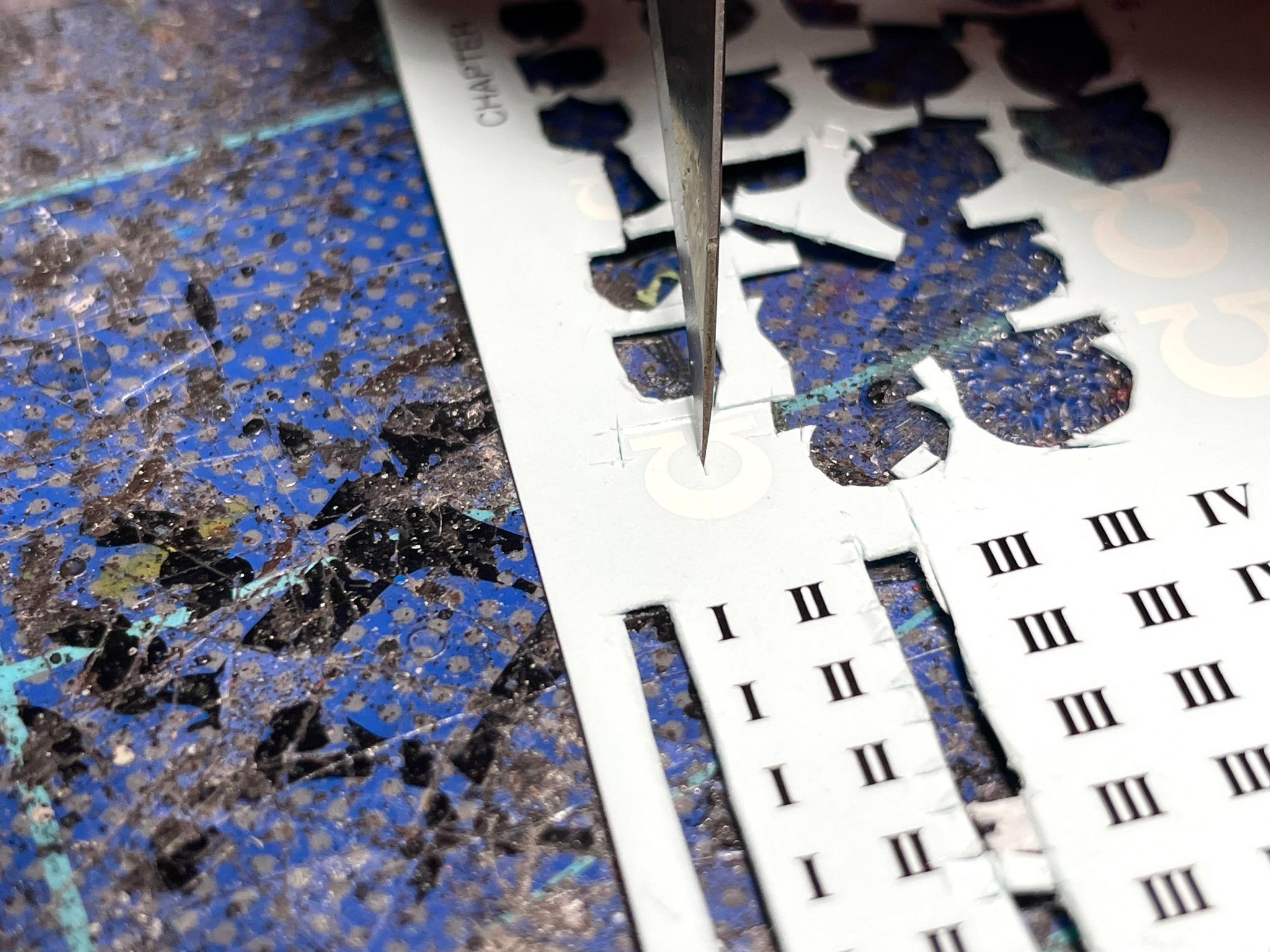 SRM: The first tool you'll need is a sharp knife with a fresh blade to cut out your transfers. A dull blade can catch on the paper, tearing or wrinkling the transfer, or skip and suddenly find its way into your thumb. A sharp blade will cut cleanly and evenly, and offer you more control. You'll also want a surface like a self-healing mat, thick cardstock, or something similar to have under your transfer paper and keep your table from getting cut up. Once you've got your workspace ready, simply cut around the transfers you want to use on your model and set them aside. Apply firm, even pressure whilst cutting, only pushing enough to cut the paper. If you didn't cut through the first time, you can always go back for a second pass. It's better to cut twice than push too hard and snap a blade. You should leave a bit of space around the design itself, but be careful not to cut the actual transfer. I like to cut out all the transfers I'm using on a model at once, and place them next to it on my workspace. If I'm working on multiple models at once, I'll group them accordingly.Relief Cuts