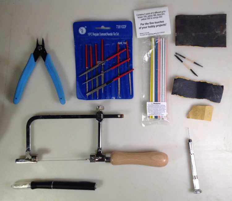 Clockwise from top left: Clippers, Needle file set, sanding sticks, sandpaper, pin-vise, x-acto knife, jewelry saw.The two most important tools I use here are a jewelry saw and x-acto knife. A jewelry saw is great for cutting through thick plastic or delicate pieces without the danger of damaging a model or slipping. The thin blades mean minimal impact. Sandpapers of various grit can remove material quickly or smooth surfaces. Most material removal is done with the needle files. They are great for fitting into tight spots. The sanding sticks and strips of sandpaper are used where they can reach. 400 grit or more is done for smoothing. I have a couple toothpicks with sandpaper superglued to the ends of them for smoothing in harder to reach spots.
