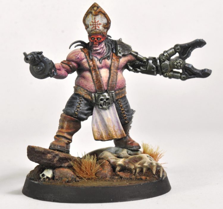 The gang slots pretty nicely into Necromunda Helot Cult. It brought to mind the question of who would fit into the Demagogue role for the gang. The characters fit nicely into the disciple, witch, and familiar roles. They are very cohesive as a gang, but none really stand out as the leader. From there, the idea for this build came together from figures and bits that were already on hand. The body would be from the Bloodstoker. I got this guy because he has a great whip bit I wanted for another project. Taddeus the Purifier's hat seemed like a great fit for the character, an official symbol of religious authority bent to his own dark ends. I had Taddeus because he's such a great Ministorum weirdo. From there it was just a matter of figuring out how to arm the Demagogue. Bits from the Orlocks sprue would help him fit in with the scheme of the rest of the band.