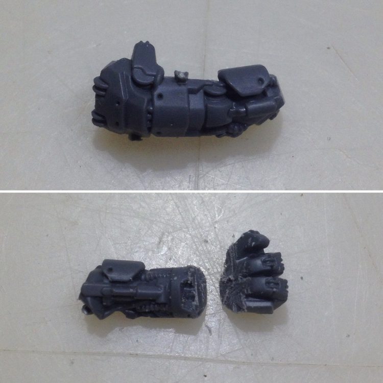 A wedge was cut out of the shoulder with the jewelry saw for an Orlocks pad to slot into. Initially I wasn't 100% sure about replacing the whole arm, but decided to go for cutting it all the way off.