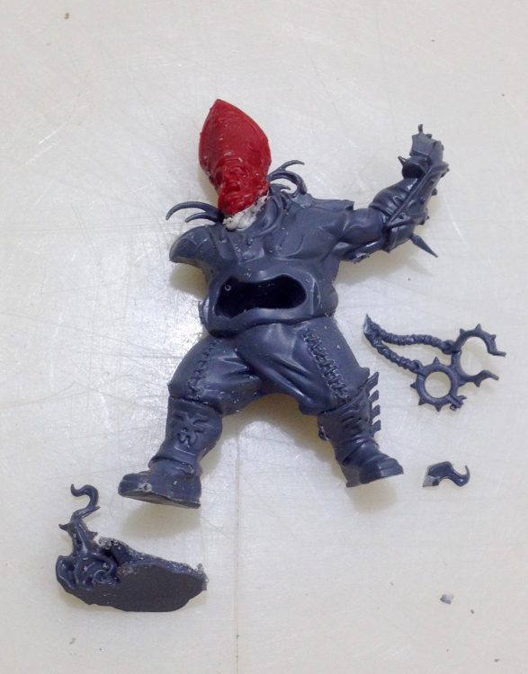Now to deface that hat! The ministorum symbol was carefully shaved away with a sharp x-acto blade. Once it was mostly flat, sandpaper was used to do some final smoothing. The x-acto was used again to carve the back of the neck down to fit on the body. It's important here to cut away a little, then test fit until things line up nicely. Cutting too much away isn't too big of a problem though, because green stuff can compensate for any overzealous carving.