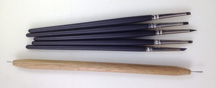 Color Shapers and sculpting tool.For sculpting I have a set of firm color shapers and a tool I made from a piece of dowel rod and a paper clip. There is a part of a paperclip in either end, one is sharpened to a point, the other hammered flat to make a tiny spatula. Having water on hand to keep the metal tool wet is important, otherwise the greenstuff will stick to it. The color shapers are used for smoothing and gently moving the putty and the metal tool is used for moving putty and forming up shapes. Here are some general sculpting resources I found helpful:
