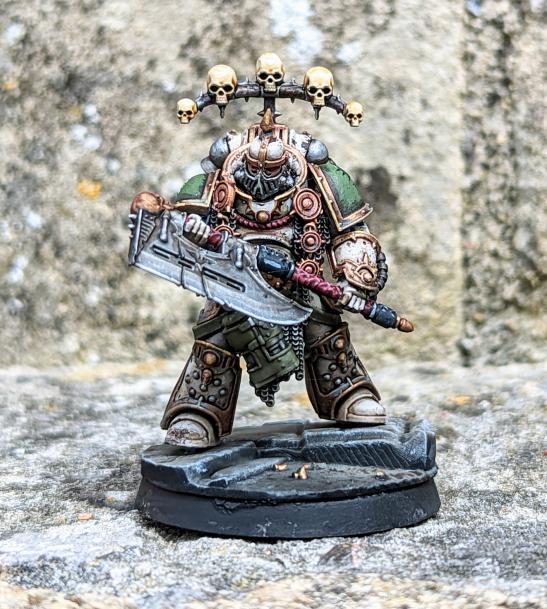 Death Guard Praetor, Credit: SerotoninThe back banner had to go too, although not in its entirety. The idea of a grisly skull rack felt perfect for Death Guard but the ostentatious eagle was easily snipped off with minimal effort. This just left the head. At first I tried it straight off the sprue but the huge top knot wasn't doing it for me. I snipped it off and it looked better but it still didn't feel enough. Then I remembered I had a left over helmet from my Forgeworld head upgrade pack. As soon as I glued it in place it felt right. Not the most sophisticated conversion in the world but I now look at him and think ‘Death Guard’.
