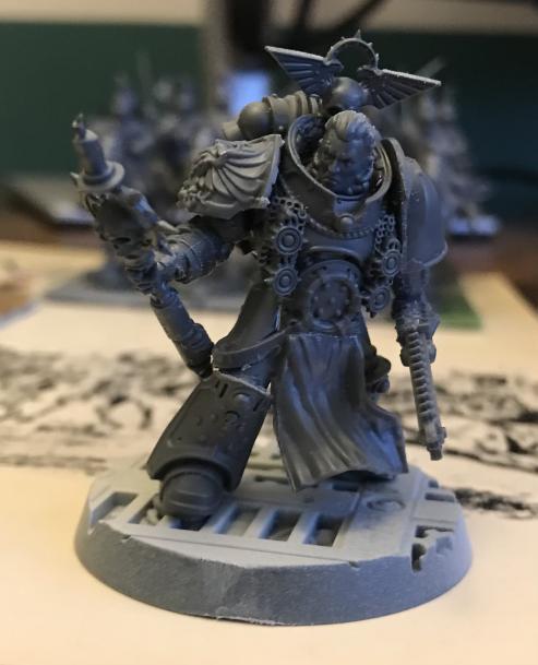 I didn’t really want a second generic praetor and I really wanted to have the option to take a Castellan for my imperial fists. Fortunately, I had the heavy weapons upgrade sprue by the time it came to build the model so I assumed I would have the bits to do something I thought would work. Mind you this is the second time I have ever done a conversion that actually included cutting anything!The initial work was just to build the model up to the point where you would put the arms and little detail bits on, leaving the cloak off because I wasn’t feeling the need for it. I will admit to scraping some of the little spikes off the helmet as I find those a little goofy looking.