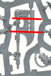 Cut along the red linesChopping down the axe was surprisingly simple; I just took a sharp knife to just below the two-power weapon stick n knob things and then glued them together. I tried to fill in the gaps, but I am bad at this so I expect you can do a better job. Getting the axe on the model was a bit more tricky, I could reuse the default arm with minimal modification to the wrist, but there is a cable that normally runs from the shoulder to the handle of the axe and getting it to work with the new position was a bit of very careful bending and superglue.