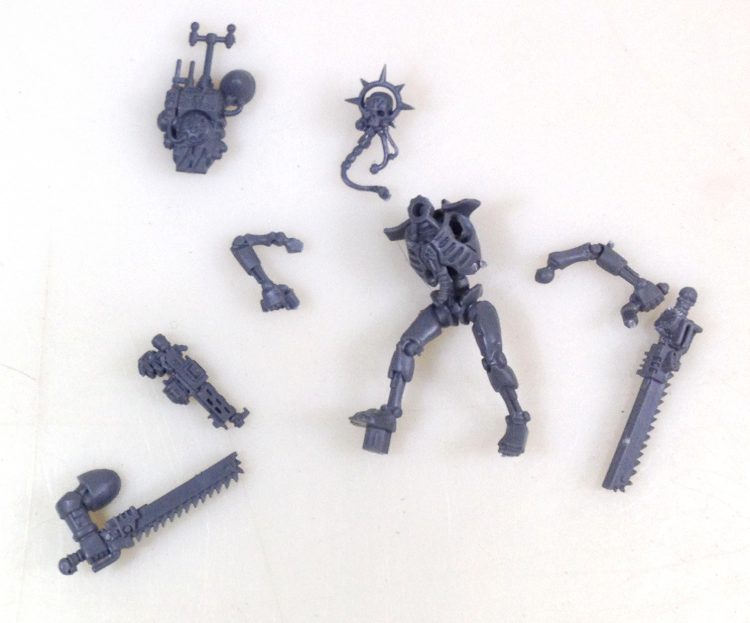 Placement of cyber skull.And here is the build with a final few additions. The joints were rebuilt with green stuff where the saw had cut some of the detail flat. A purity seal was added, this one was cut off of Pious Vorne from Blackstone Fortress. I liked its length. Finally I shaved off the Necron symbol from the chest. It will make a good spot to paint on an Inquisition symbol.