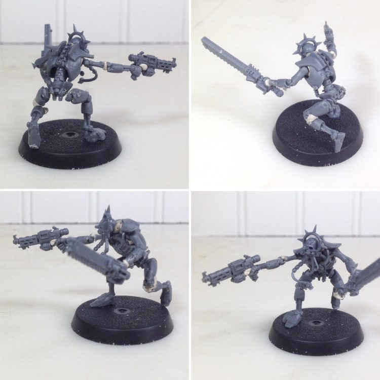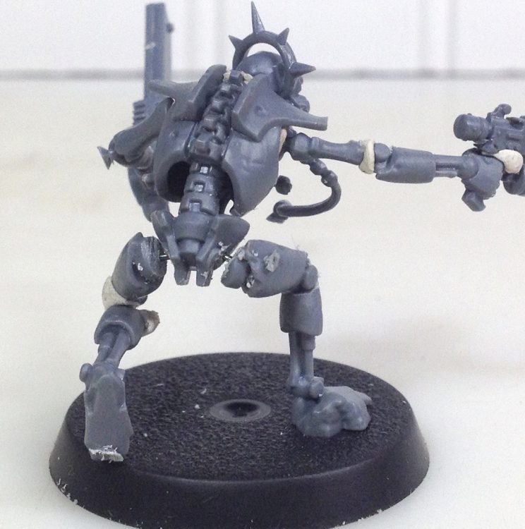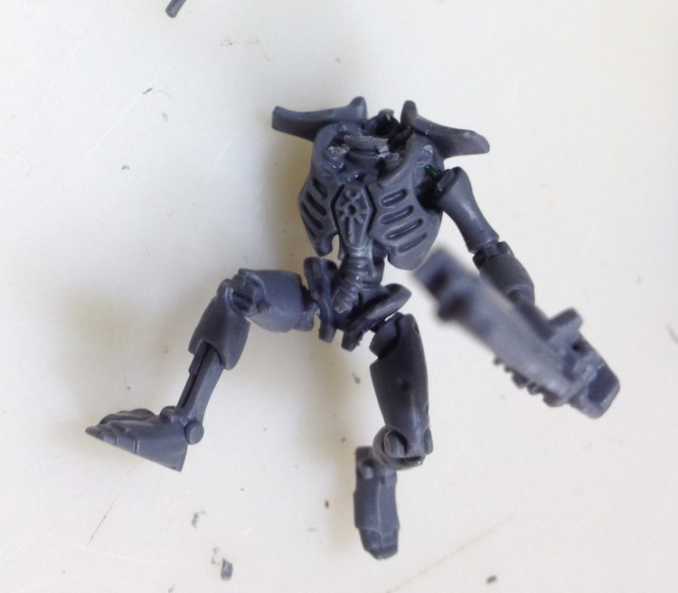 The initial bits picked out for building: Necron Warrior body, and some assorted weapon options along with the cyber-skull.The plan here is to re-articulate the Warrior and give him a more dynamic pose. My thought was to have him in a low crouch, like he had just landed after a jump. Given the anatomy of the Necrons it will be fairly straight forward to cut at the joints and do minimal damage.