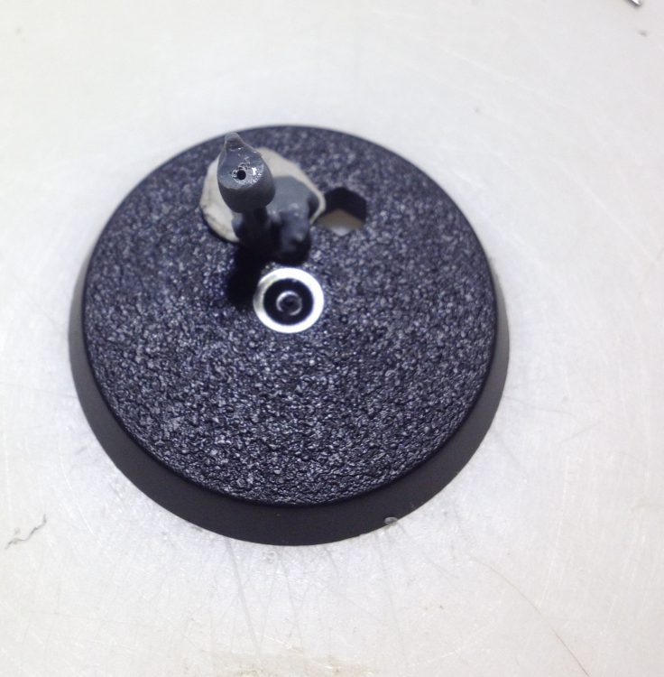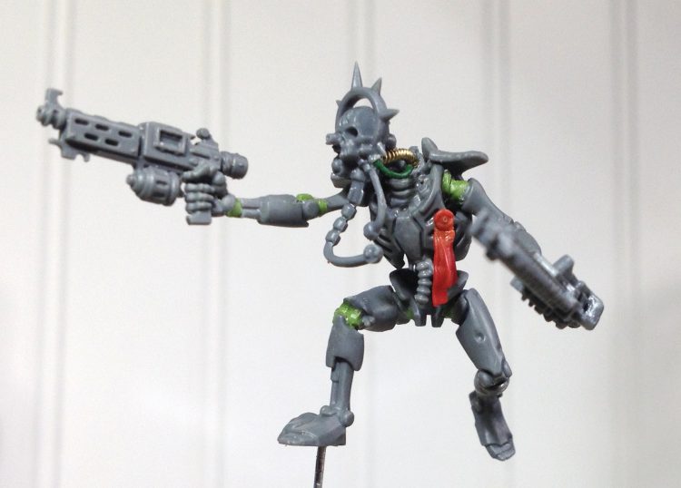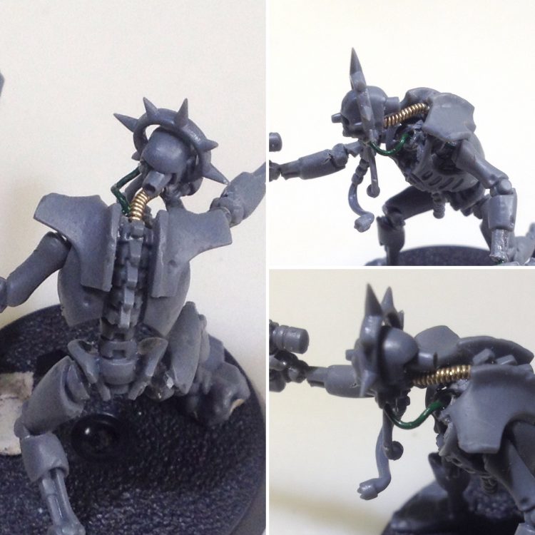 The trickiest part of this build was doing the wiring for the cyber skull. A piece of guitar wire was bent and cut to allow the skull to connect to the spinal column. I wanted the skull to be facing the direction of the stubcarbine and also to be slightly forward of where a head should be to give it a bit of a floaty feeling. The guitar wire is easier to bend to approximately the right shape before cutting it. Bending it around the shaft of a screwdriver or other metal rod allows it to bend in a more natural, smooth way. Trying to do all the bends with pliers can leave the curves looking too sharp. However some final adjustment was done with a pair of pliers. The smaller wire is the same floral wire I used for pinning. Both wire were superglued into holes drilled in the cyber skull.