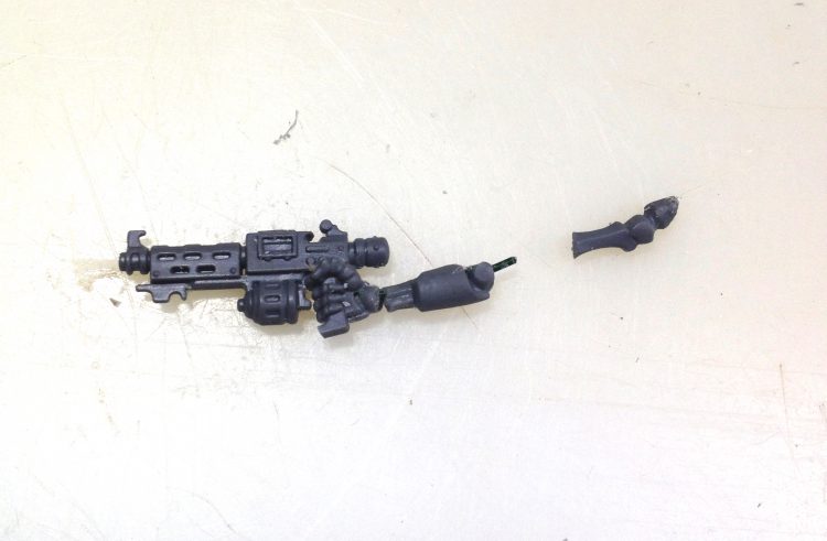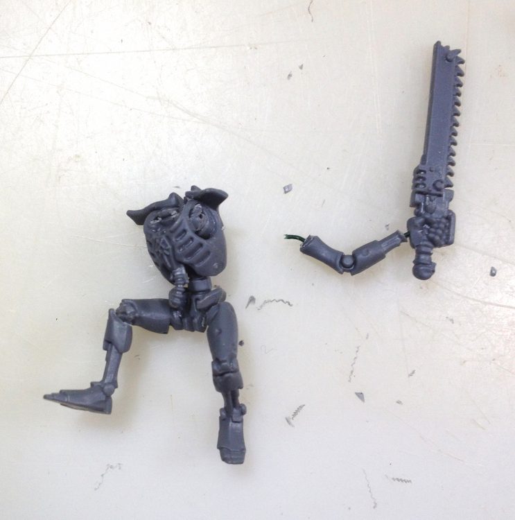 Holes for shoulder pin.I went with a chainsword for this arm, using one that already had a bionic hand holding it. It fit very neatly with the Necron aesthetic.