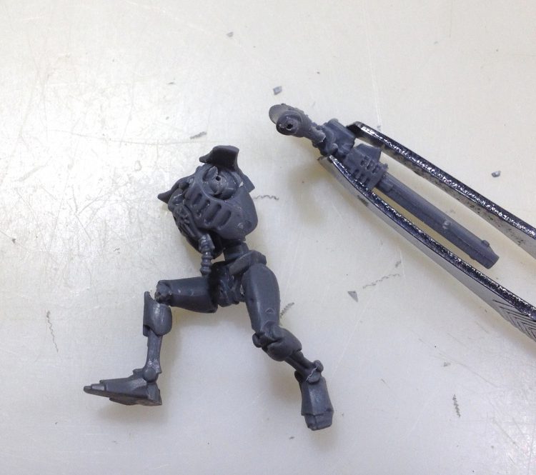 Sword arm superglued in place.The hand on this side was already holding the handle for a weapon. I carefully cut the hand off the stubcarbine with a the jewelers saw and shaved it down to fit the correct angle with an exacto knife. It was glued together with plastic cement. The elbow here had the drill/pin routine done to it.