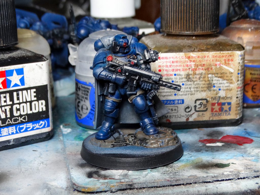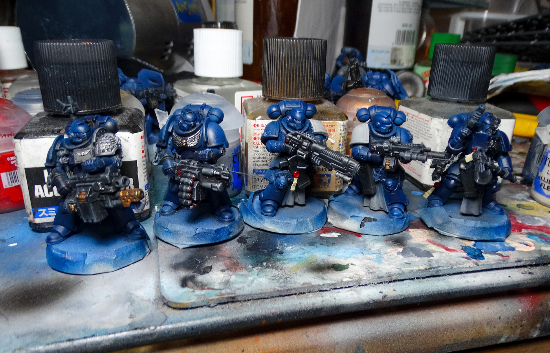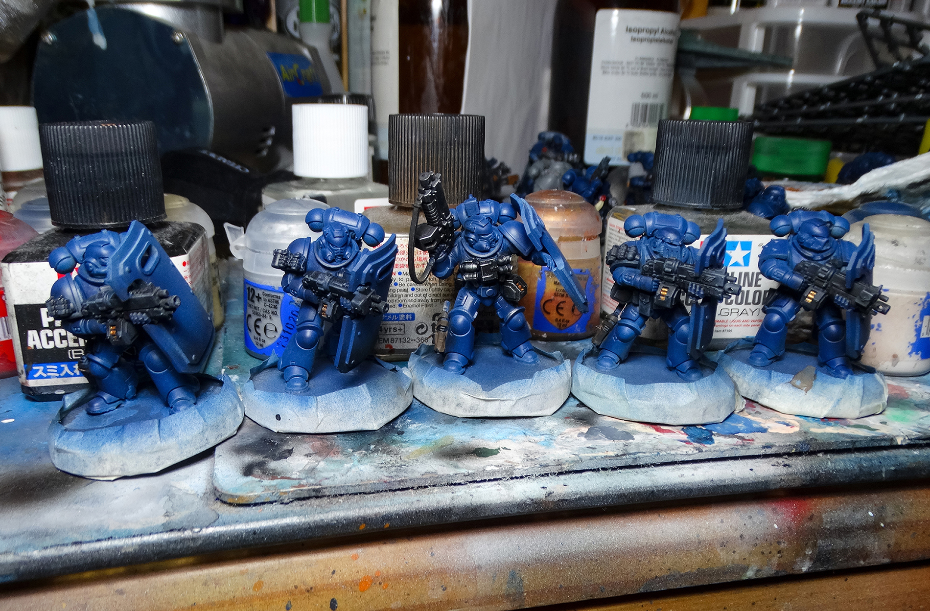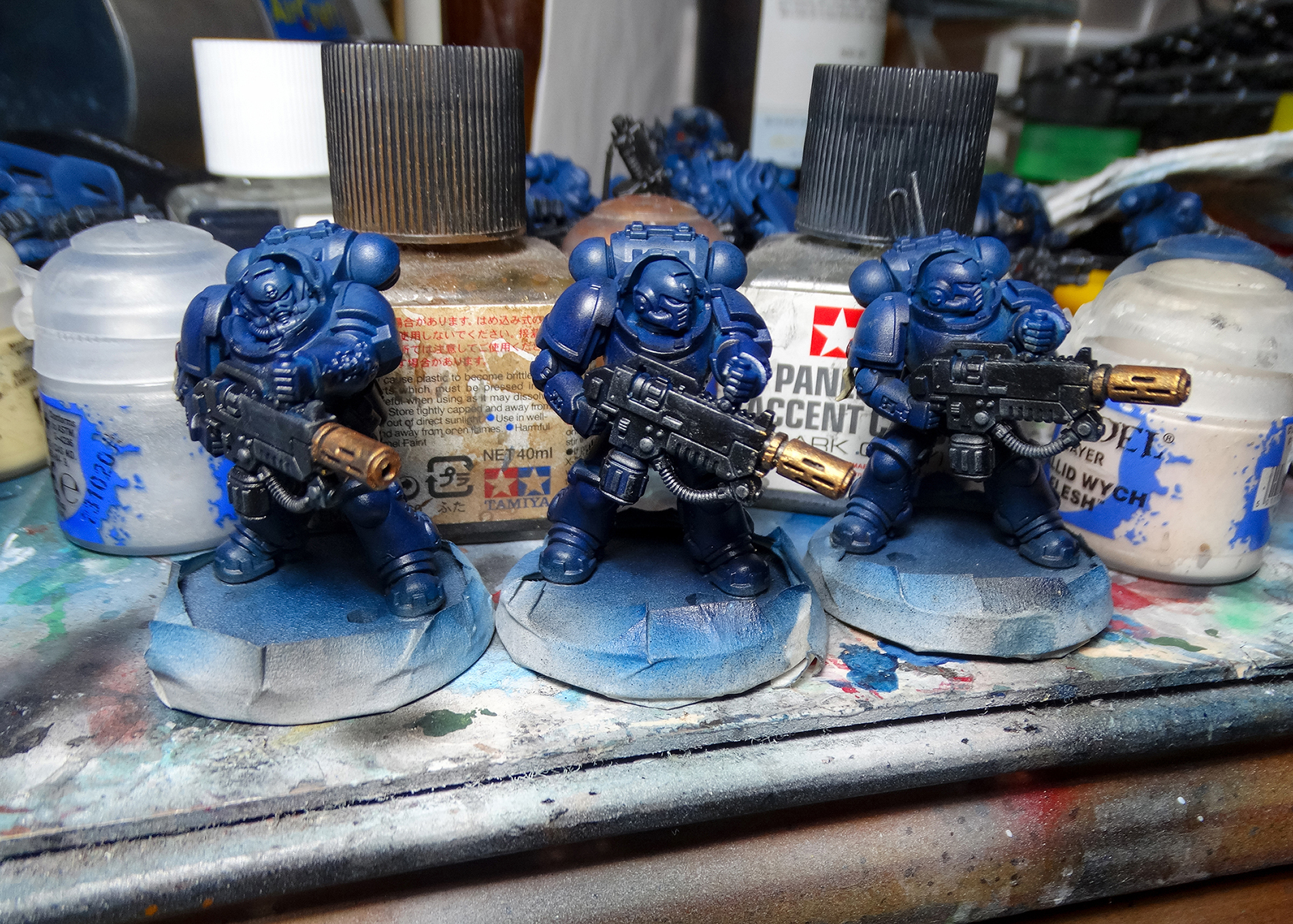 The most significant deviation from my old style of painting is that I've switched from Citadel Air to Tamiya for my main blue. Citadel Air's formula is absolutely dreadful, but I was a loyalist. After much emotional build-up, I cut my losses (with three unopened bottles of Citadel Air Kantor Blue) and tried a Tamiya Royal Blue. It sprays better.