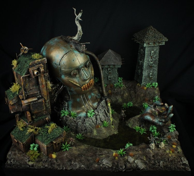 "I really like the atmosphere of what feels like a full set of scenery. the colors fits nicely together, and the subjects feels odd enough that i'd like to know more about this place. Well done! A pleasant diorama with a good variety of shapes and textures, executed with high technical skill. Balanced and intriguing. Easily legible for how huge it is. Great textures."