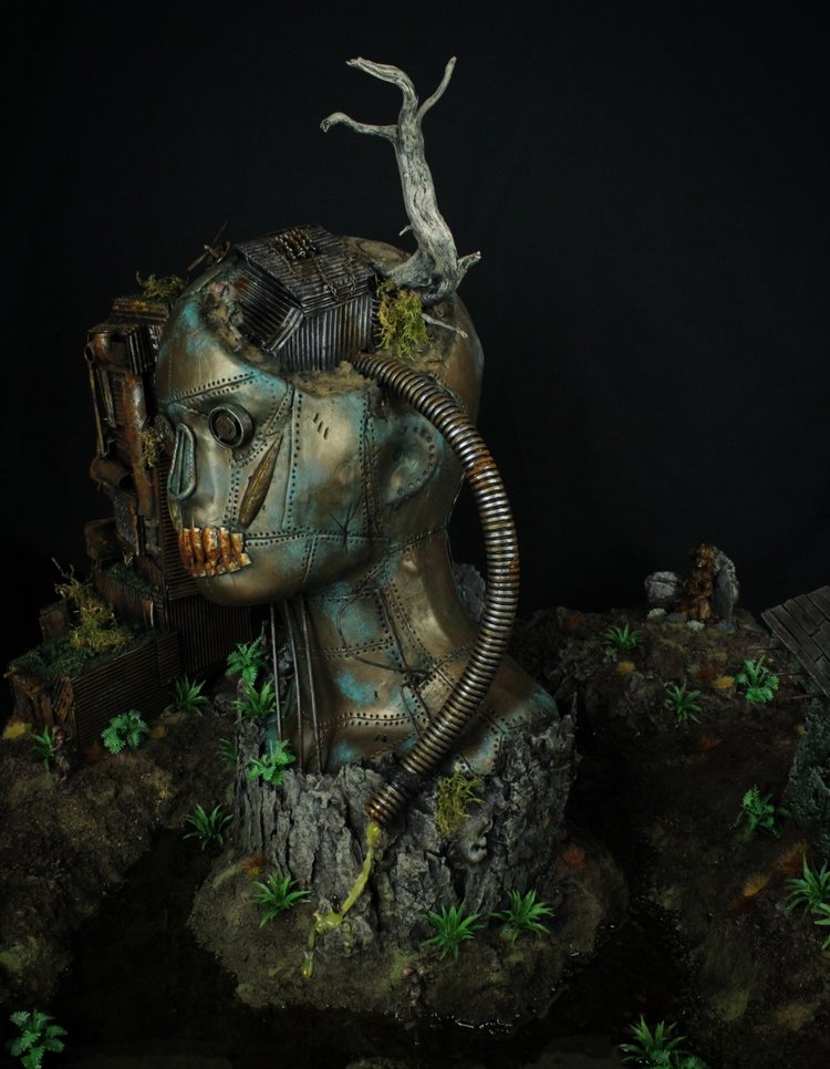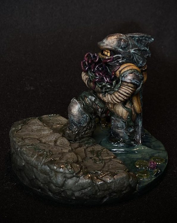 "The Sea mine for a head gives this merman an enigmatic and foreboding feel. Nicely executed pose and base, with a bunch of thoughtful sculpting. Really fantastic atmosphere, the earthy textures work really well against the unnatural colors, and the lighting is marvelous."