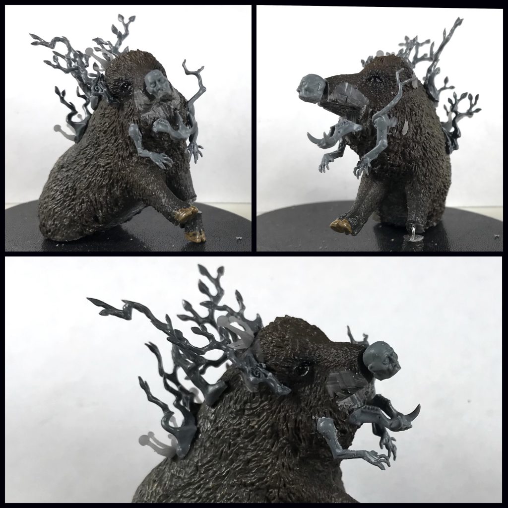 In addition to the boar and human aspects of this creature I wanted vegetation and mushrooms growing from its back. Arms from the Soulblight Gravelords Deadwalker Zombie kit with a branch emerging from its shoulder, and branchy bits from several Sylvaneth kits filled the role. Several mushrooms from 3d printed basing bits were glued to its back too.