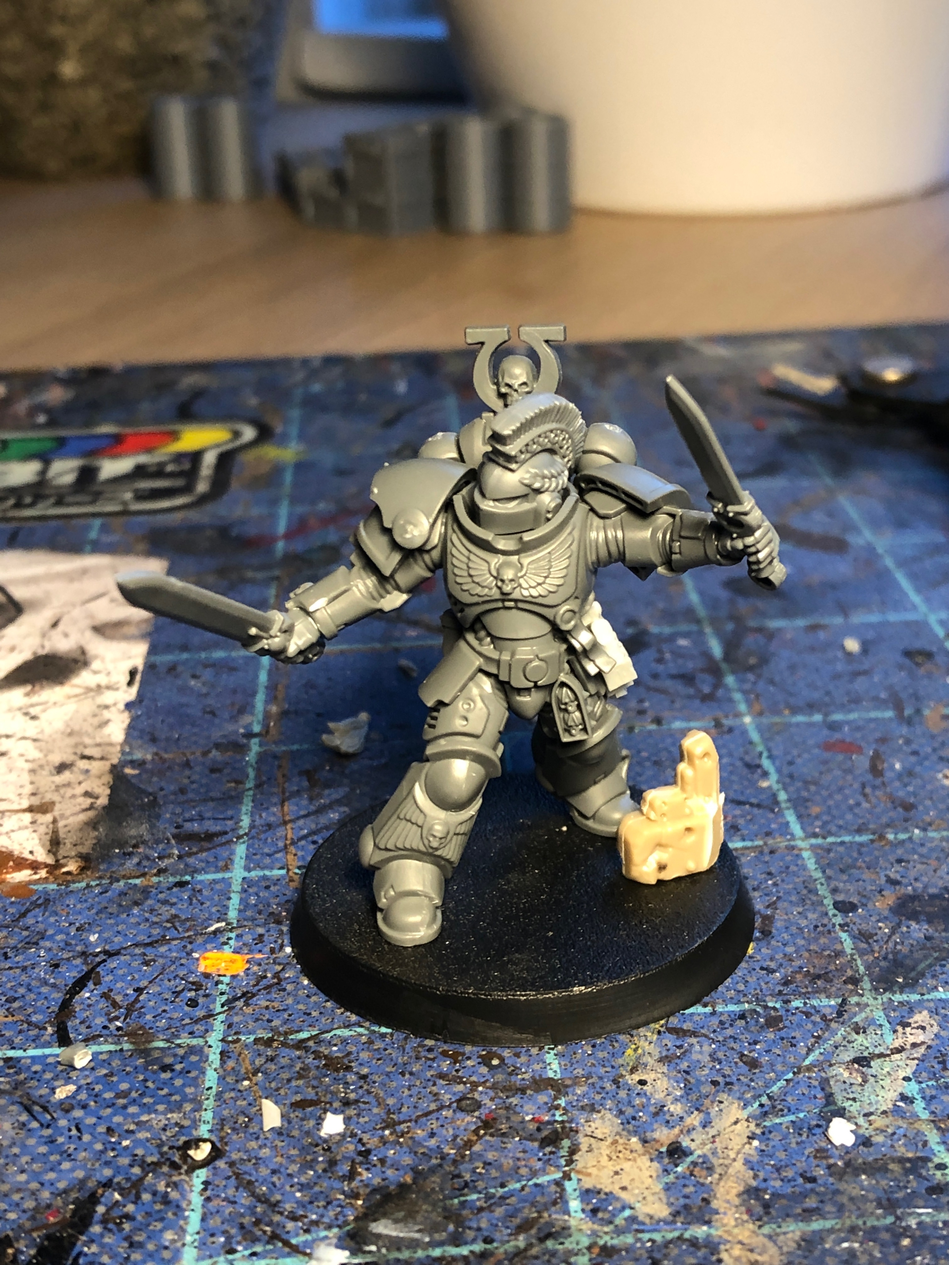 WIP Chapter Champion. Credit: SRMI knew I wanted to give him a defensive duelist's pose, as this wasn't some frothing-mad Templar, but a cool and calculating Ultramarine who defeats his foes with FACTS and LOGIC. I picked the power sword Primaris Lieutenant body out of the Dark Imperium box set, as I wanted something suitably ornate (well, ornate for a pre-Indomitus world anyway) that would stand out from the pack. I used the power sword arm as well as a pointing Intercessor arm, and swapped in a pair of Ultramarines gladii from the old Ultramarines upgrade pack. I slightly angled them towards his center to give him a more defensive stance. His head also came from this pack; it's suitably knightly and Greco-Roman looking, and is a dead ringer for the one on the old metal Chapter Champion model. I really dig this set over the newer Primaris-focused one, as I find the bits to be more characterful and ornate.