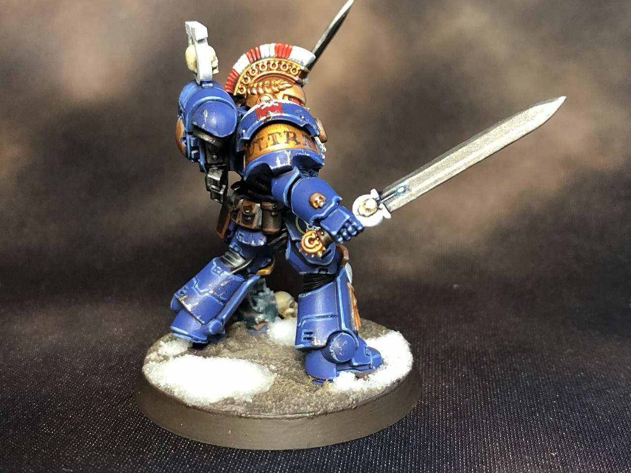 Ultramarines Chapter Champion. Credit SRMI did this freehanding pretty early in the painting process, so I could go back and clean up any mistakes with Retributor Armour before applying any washes or highlights. His extra shoulder armor was looking a little dull, so I added a flashy red racing stripe and a white Aquila decal over it. When it came time to weather this boi, I concentrated more scratches on this side as I figured it would be his "defensive" side. I figure he would be blocking with his bigger sword and uparmored shoulder, and would actually be delivering the killing blow with his smaller gladius.