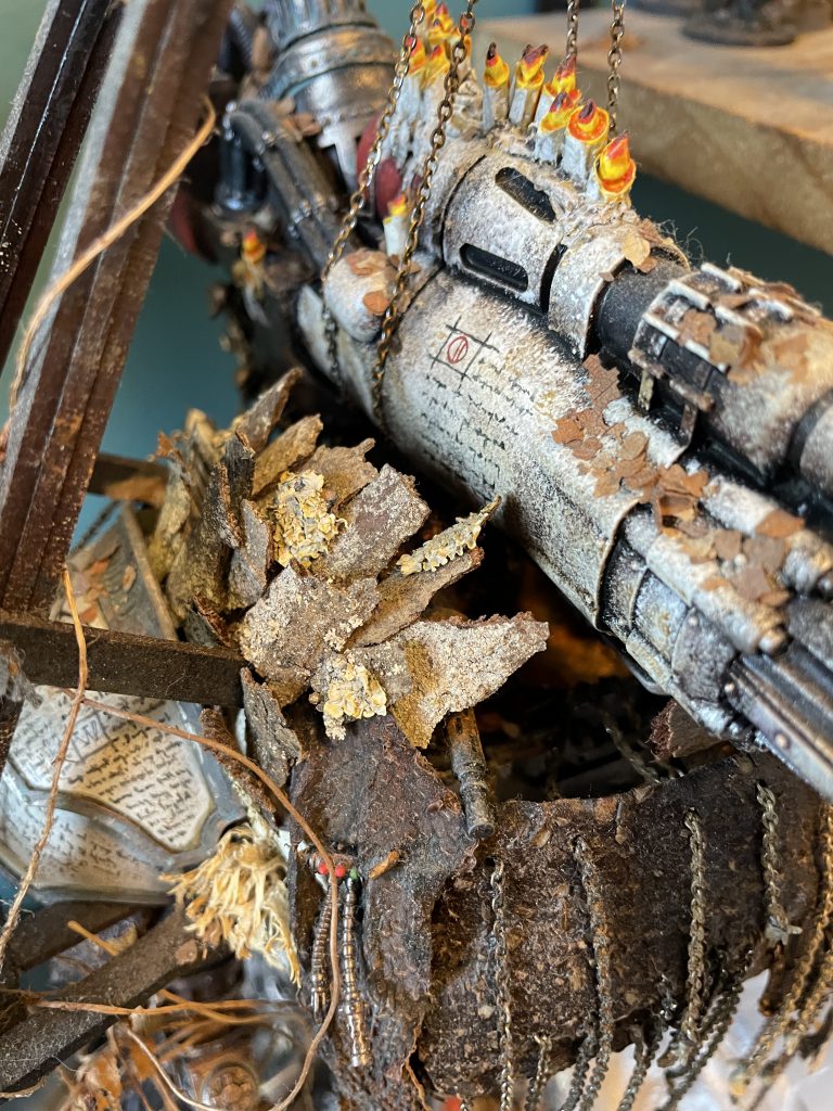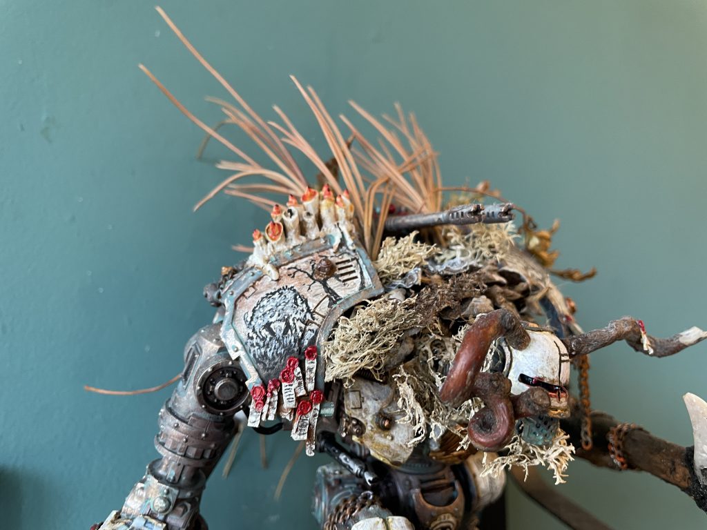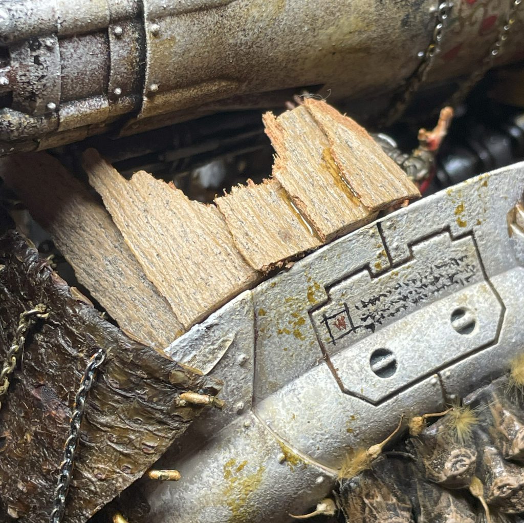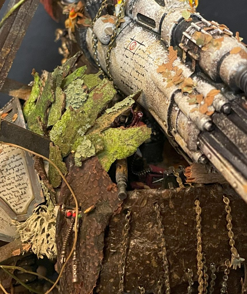 Freshly applied bark and LichenIt's not all doom and gloom – the look of a model that incorporates natural materials will change over time, which is a beautiful and strangely touching thing. The bark covers of my Porphyrion have faded and weathered into the same colour scheme as the plastic – almost (but not actually) as if this process was planned to compliment the colour scheme. Time acting on plant based materials is a good thing, and will create unexpected moments of beauty, even poignancy, as your models change and decay.