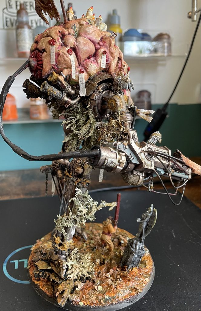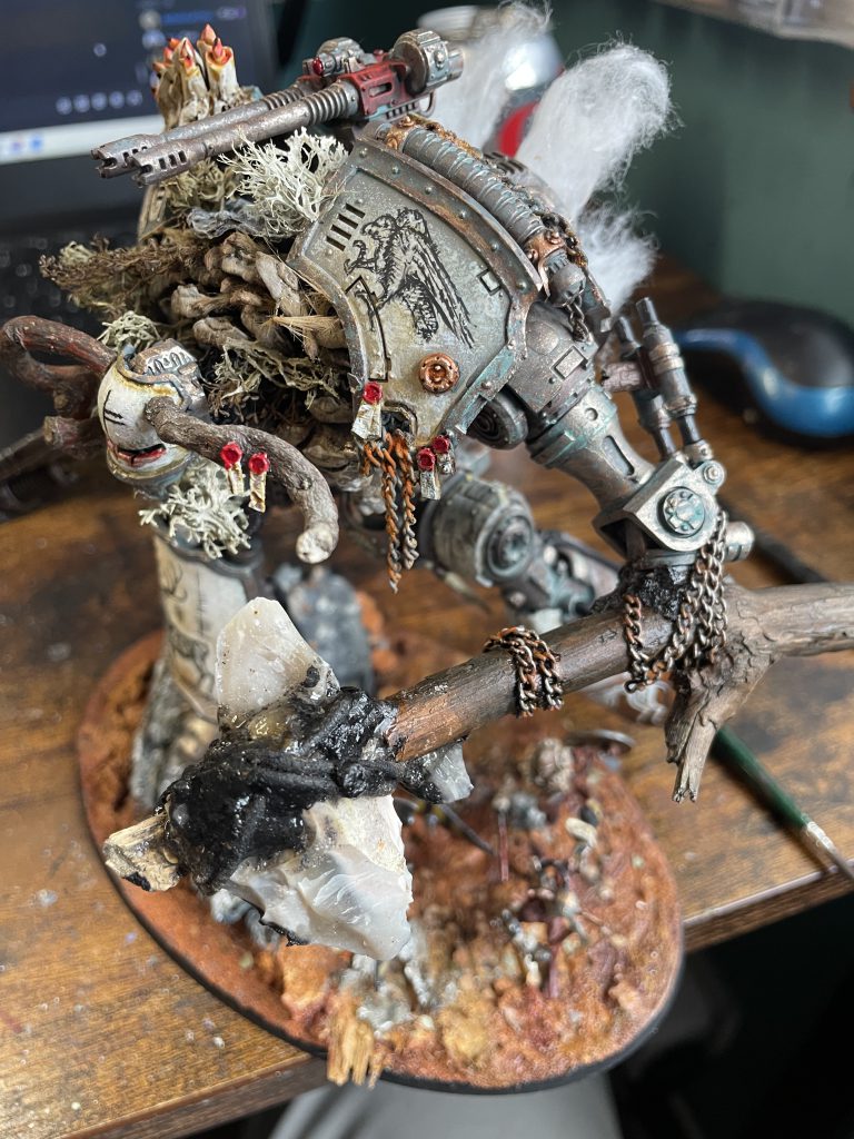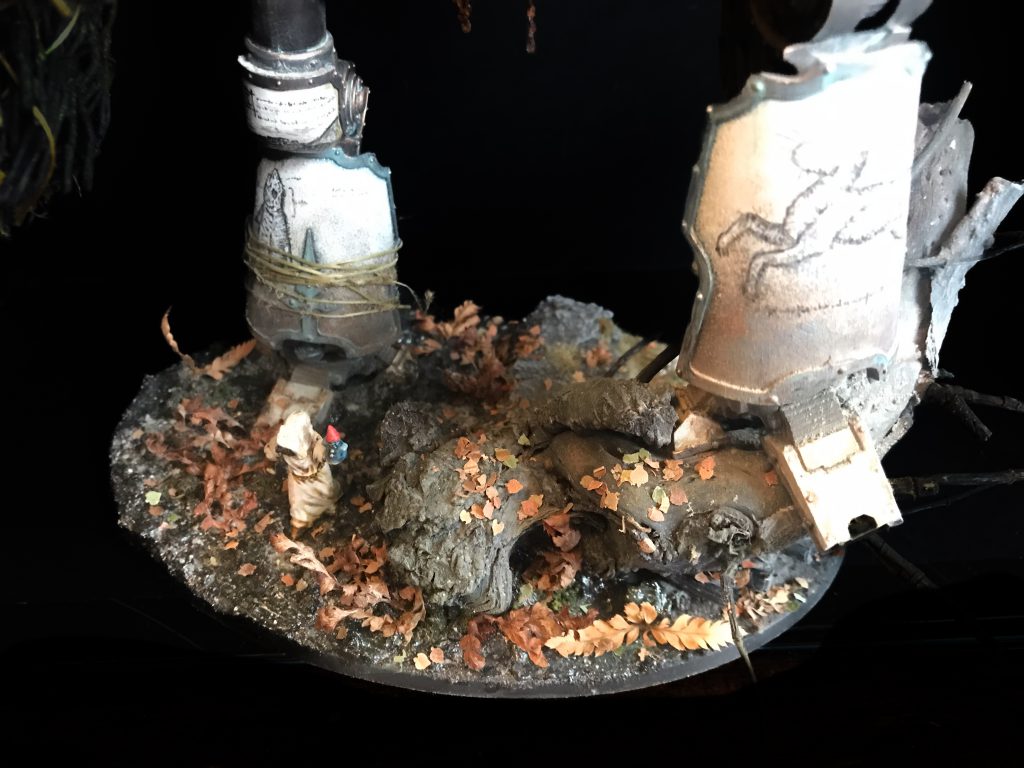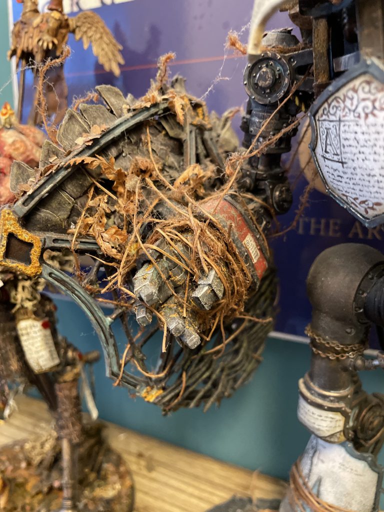 Freshly applied bark and LichenIt's not all doom and gloom – the look of a model that incorporates natural materials will change over time, which is a beautiful and strangely touching thing. The bark covers of my Porphyrion have faded and weathered into the same colour scheme as the plastic – almost (but not actually) as if this process was planned to compliment the colour scheme. Time acting on plant based materials is a good thing, and will create unexpected moments of beauty, even poignancy, as your models change and decay.