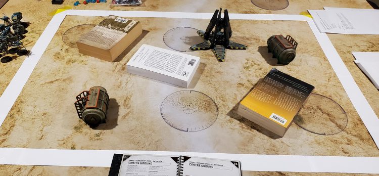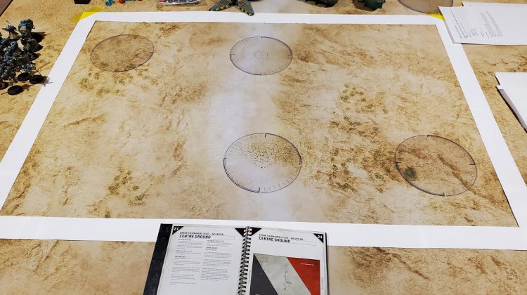 These interact with terrain very well. Neoprene mats are raised and so terrain can be lifted off the table. These allow terrain to lay flat and are unobtrusive when you place terrain on the board. The inner marker is clearly marked so you know where you can and can’t place stuff. For example, the below image shows an illegal placement of terrain (left) and a legal one (right).