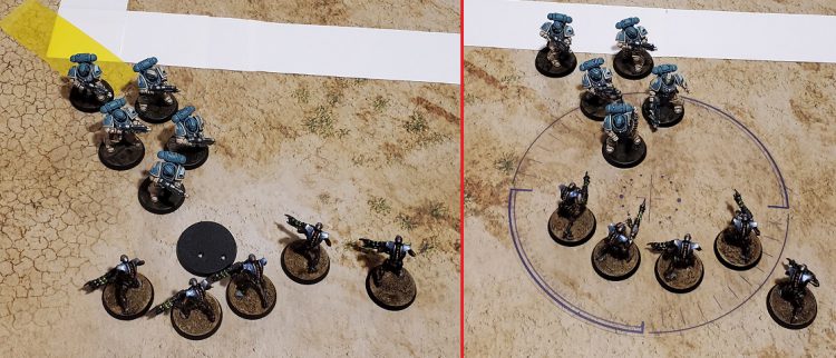 It’s not immediately apparent who is controlling this objective on the left. At a casual glance it looks like it is evenly contested, but measuring would show that the 4th marine is out of range, while 4 necrons are in. The new objective makes it clear at a glance. I am not much of a tryhard and my games rarely get chippy, but knowing instantly who is in range of what seems like a positive outcome for both players.