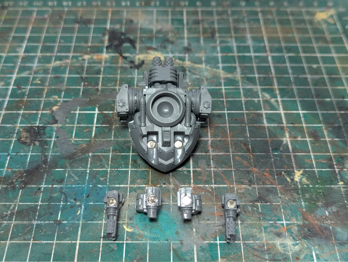 One aspect of this kit which deserves praise is inclusion of inset holes to mount magnets for easy weapon swaps. Coming from Adeptus Titanicus, I am a magnet pervert and am grateful for the inclusion of these. As you can see below, holes are present on the top carapace mount, the torso guns, and on the backpack and shoulder for the arms.