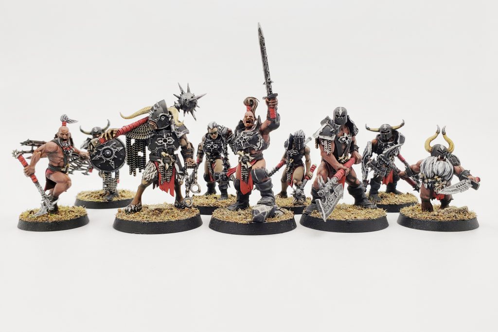 Chaos Marauders might be a good shout for your infantry base - they certainly have a feral look to them! They're a fairly ancient kit, but with a very flexible multipart base, they'll mix in well with many other kits. Warcry warbands give you more modern sculpts, and usually come with a variety of hideous weaponry that will really sell the combat look.