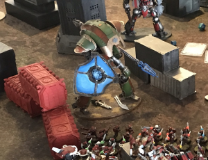 What is the org chart? It’s kinda simple. Each Lord of War Knight slot requires a pair of Armigers to accompany it. Every Knight (400-750 points) thus must have about 400 points of squires with them. This org chart demands a varied army composition, with your little Armigers (who have line) screening and grabbing objectives, while your big Knights murder things.