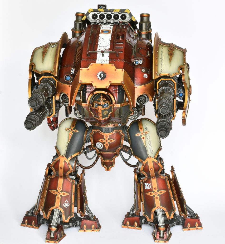 You can swap the Heavy Stubber for a Multi-Laser or a Meltagun. You can also grab some lil’ turret weapons, either an anti-flyer Icarus autocannon, a large blast AP4 Ironstorm Missile Pod, or an AP3 3 shot Stormspear missile pod. All of these are fine, and a good way to spend points if you have some left after buying your favourite Household Ranks. If you want to run a Questoris, I’d do it with a Thermal Cannon and an Avenger Gatling Cannon. I’d take 2 Thermal Cannons if I could, but the Gatling Gun is better than the melee weapons.