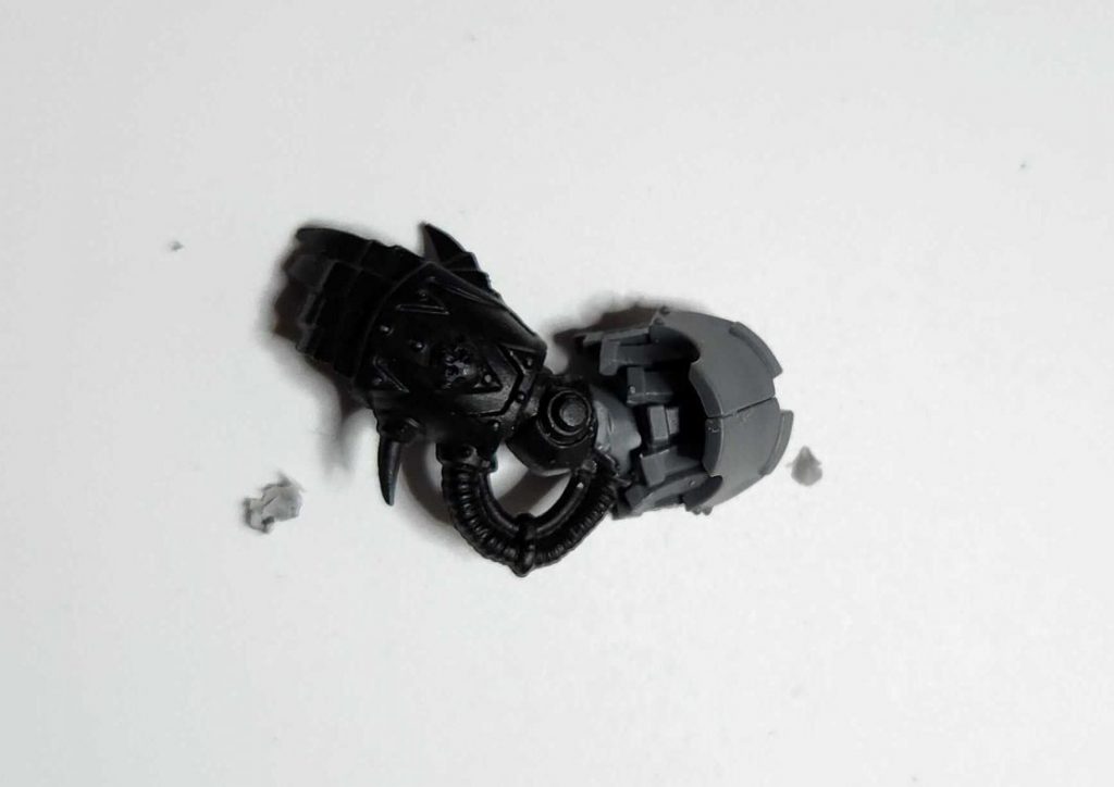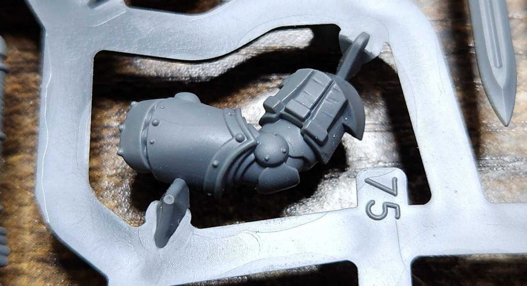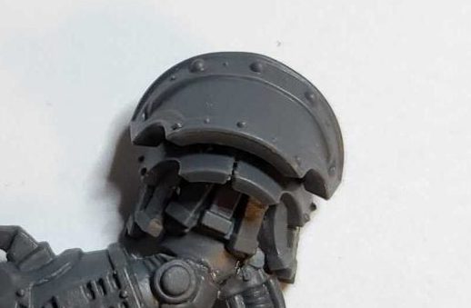 Let's start with what I think is the most important part of this kit: The shoulders. These are now assembled in four parts: You have the arm itself, around which you assemble the first shoulder plate in two pieces, which glue together along their middle line and have a ridge on which you'll glue the final shoulder plate.