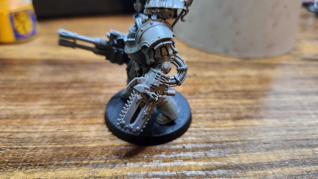 This took a lot of work but I was pleasantly surprised by how well all the pieces lined up. The tabard there is from a Chaos Space Marines champion model (non-Terminator), and I've been pleasantly surprised at how well these pieces have fit together. They don't need a ton of work, except for those shoulders, where I've glued a Lord of Contagion cape and body onto one of the new terminator front plates. That said, the head enclosure sits at a bit shorter angle, and if I had to do this again I'd leave more room for the head to fit in that space.
