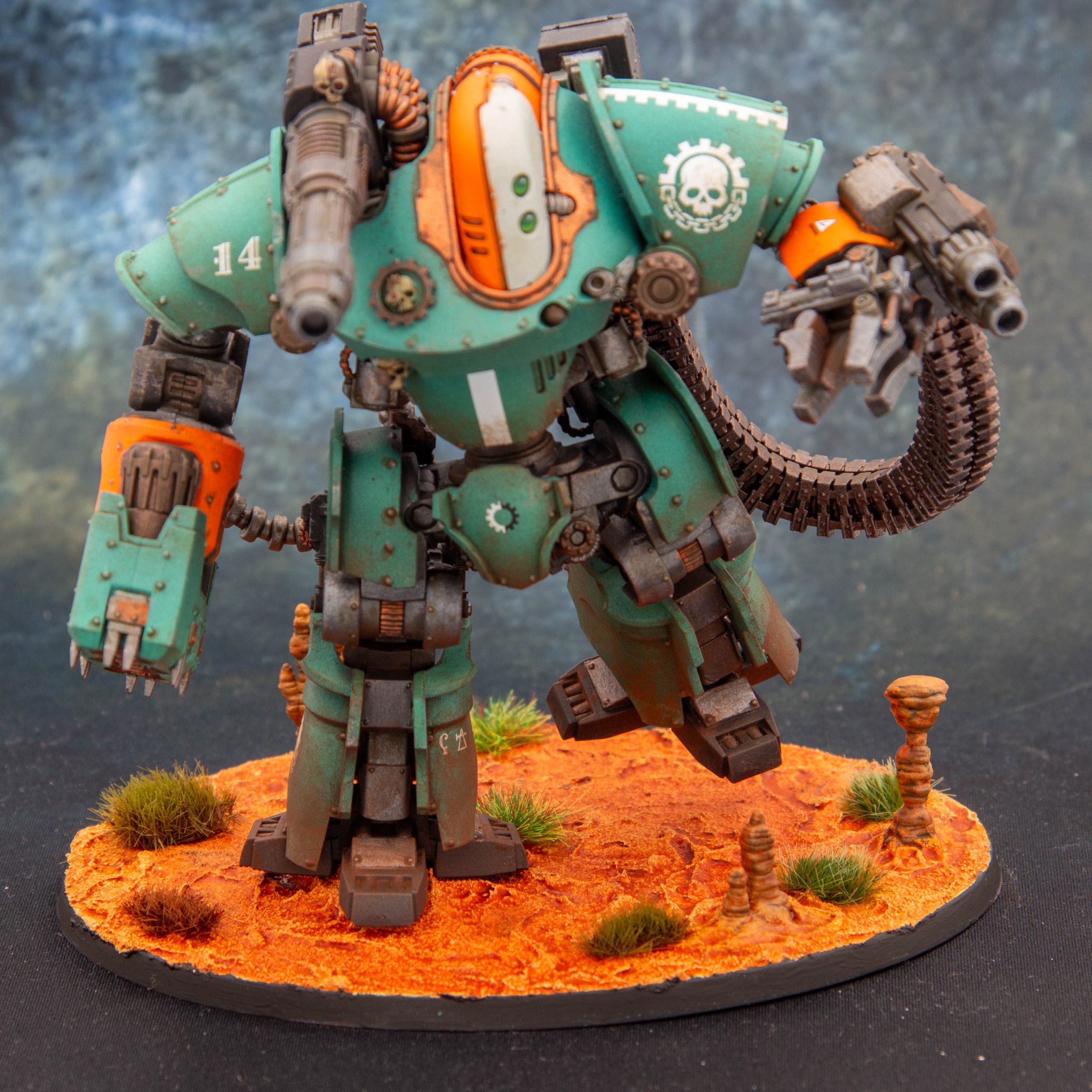 Funnily enough, both I and RealSnice were inspired by Medder’s -aROs">Mechanicum speedpainting video, which is worth a watch if you are tossing up what scheme to go. I went a bit of script using paints I had to hand and introduced orange as a spot colour. Below is what I ended up using if you wanted to try something similar:- Greens: