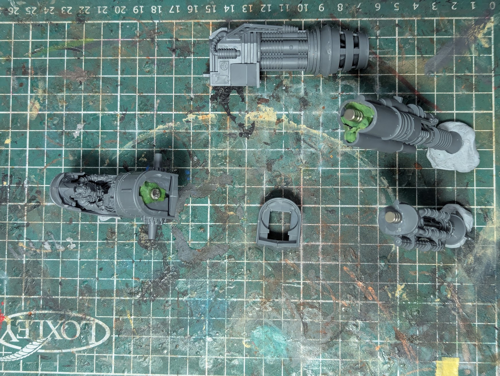 Being a longtime magnet pervert thanks to Adeptus Titanticus, I had plenty of magnets lying around to use here. In this case I simply shoved in a foundation of greenstuff in the hull with a 5x2mm magnet in the middle, and stacked a couple of 5x2 mm magnets on the lightning gun and irradiation blaster. The force from the magnets here is strong enough to keep these guns true through the adapter piece.As earlier mentioned, the friction fit on the plasma fusil requires no magnets at all. That said, I did glue in the flaps which support the gun shield which stand out a little when using the other options which I was fine with.