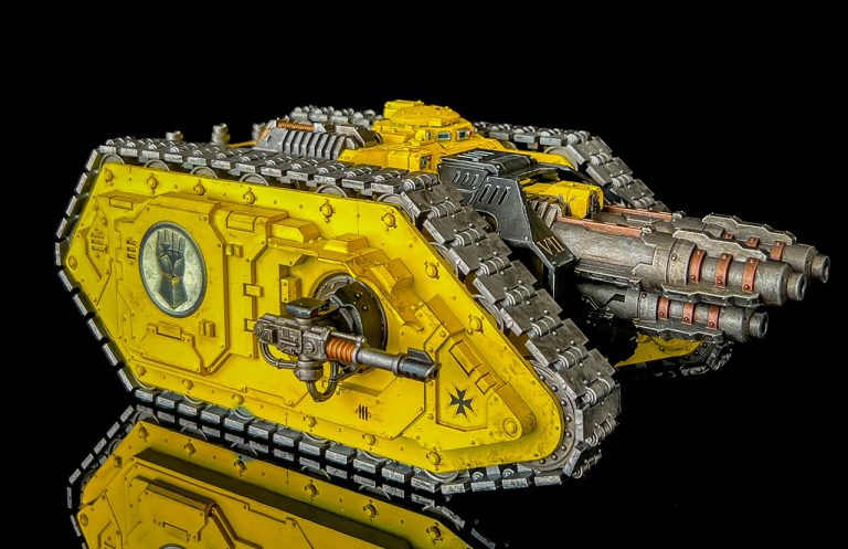 - Light drybrish Iron Warriors around edges of the tank