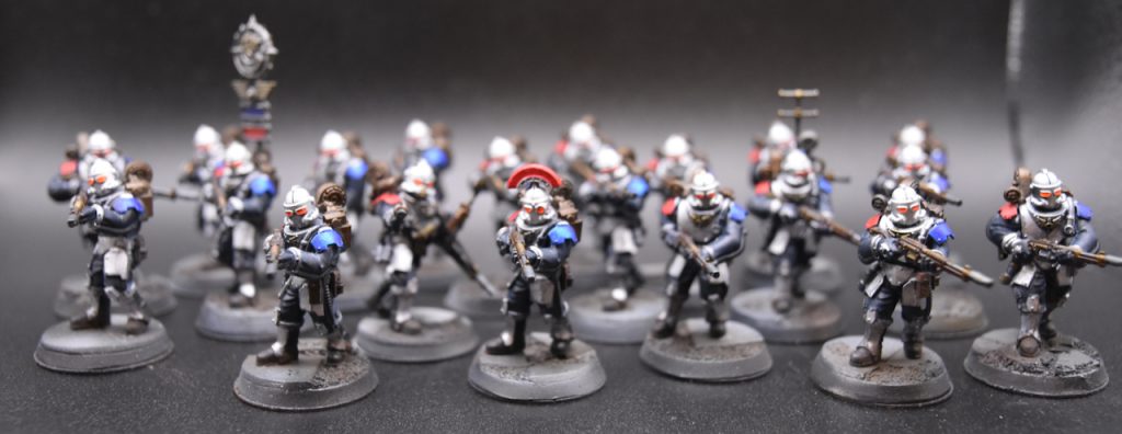 - Auxilia Sergeant with laspistol and charnabal sabre, 19 Auxiliaries with Blast Chargers, Vox Interlock,Auxilia Vexilla