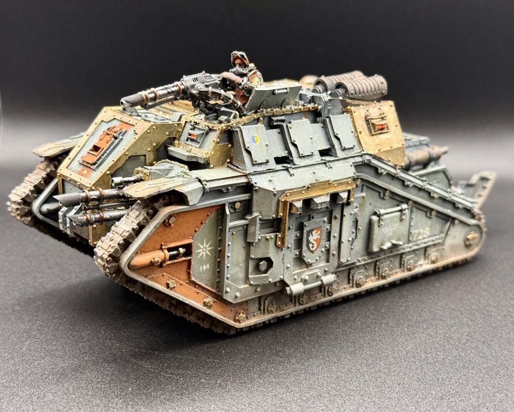 - Leman Russ with Vanquisher Cannon and coaxial heavy stubber, hull lascannon, pintle multilaser, searchlights, flare shield
