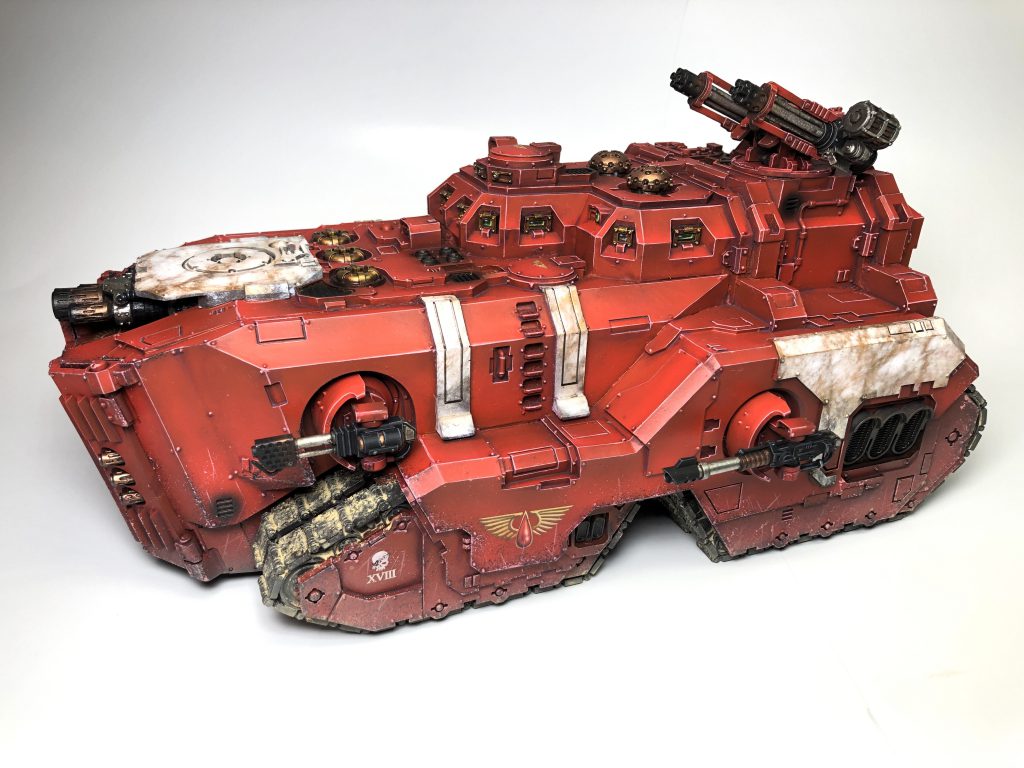 Blood Angels Legion Spartan Assault Tank - Credit: Colin WardA bigger Land Raider with 10 hull points, an enormous capacity of 26 and Auto-repair 4+. It costs a lot: 400 points. All the same upgrades are available, with the same things to consider with defensive weapons and so on.