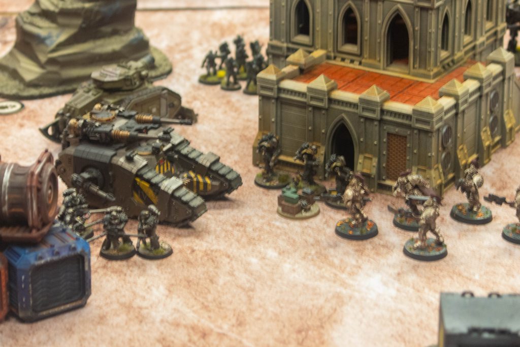 In the shadow of the artillery that defended Sapphire City, the Emperor's Children Sicarian Master of Armour crawled into the deployment on a single hullpoint and only one weapon remaining. The tank "Invicta" was honoured with the epithet Destroyer of Chogoris, surviving sustained fire from a Deredeo and a Cerberus before surviving.