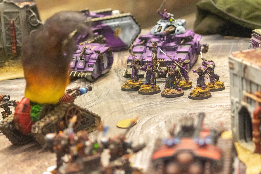Meanwhile in the Scented Flats deep in the southern hemisphere, where living biological matter still remained thanks to stilled atmospheric movement, the Traitors clawed into an early lead, advancing behind the fumes of the melting biosphere into the Loyalist gunline. Unapparelled expenditure of ammunition, venting of exhaust fumes and energy weapon discharge have kicked up atmospheric storms across the entire planet, filling engine blocks with dust, blocking targeting arrays and rendering communication useless. This armoured conflict now becomes even more frantic than before, with the very orders given to commanders seeming to change by the minute. Now, the Traitors must advance and ensure that Tallarn burns.