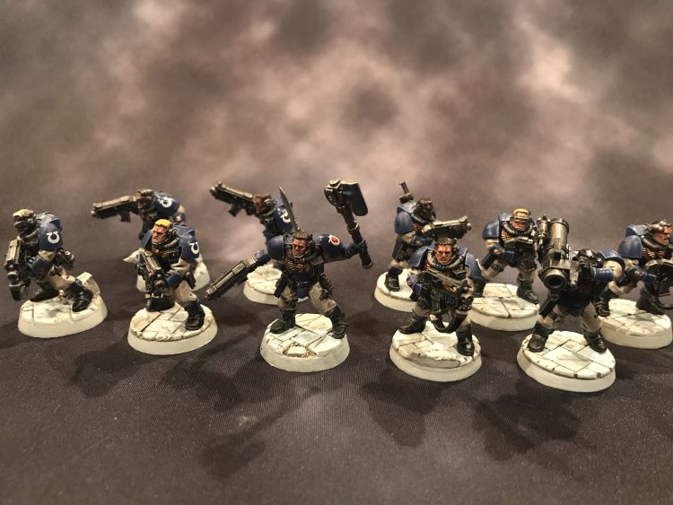 The most basic squad in the army list and the first Heart of the Legion unit here. Tactical Squads are equipped with only bolters and bolt pistols with no options for heavier or more specialised guns. They are Line and so are one of the cheapest units that can take and hold an objective at only 100 points for 10 marines before any upgrades.