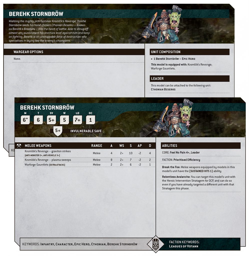 Berehk has a statline that lines up with the Beserks unit, sporting a 6" move, toughness 6, a 5+ save (with a sneaky 5++ invulnerable save), and 5 wounds. In the reveal GW mentioned his "stony" skin making him more tough, which seems to be reflected by his having Feel No Pain 4+, which functionally will make him feel more like a 10-wound model.