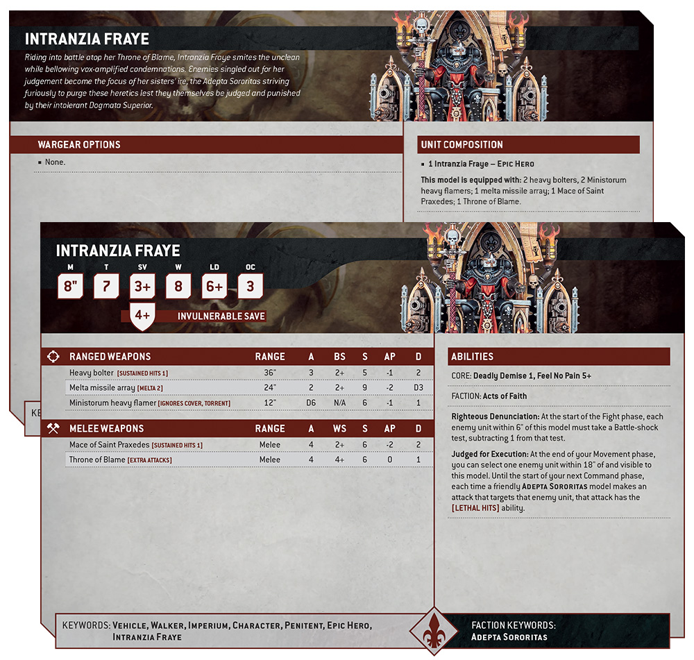 TwoHorse: This week’s earlier reveals have built a lot of hype for what Intranzia might bring to the table. Game-warping out-of-phase shenanigans like Yarrick? Sweet movement tricks and real output like Wazdakka Gutsmek? Three abilities to choose from where one is clearly the right choice all the time and the others are irrelevant? Alas no, Intranzia Fraye is…something else entirely. Let’s start with the profile: At T7, 8W, with a 3+/4++/5+++ with the Vehicle and Walker keywords, she’s similar to Morvenn Vahl, trading a 2+ save for a 5+ Feel No Pain. This is the sort of modest durability that requires deliberate but not heavy commitment to remove. If your opponent wants her dead they can kill her, but it won’t happen by accident. Contrary to what we expected based on the Adepticon reveal, she can’t lead Mortifiers or anything else for that matter, so her statline and miracle dice are the only thing between her and your opponent’s ire. So how threatening is she? With 5(!) different ranged weapons, she’s got a lot of tools, and with wildly different profiles on those weapons, it’s not clear what she plans to use them for. Two heavy bolters, two heavy flamers, and melta missiles which are effectively a pair of krak grenade launchers with Melta 2 is good chaff-removal output, but she’s not a strong gun platform. The flamers and missiles want to fight within 12”, so despite the range of the heavy bolters she’s at her best when close to the enemy…. …but not too close. Her melee profile is terrible, borrowing Junith’s bonking stick with 4 swings at S6 AP2 2D, and another 4 extra attacks with her angry chair at S6 AP0 1D that hit at WS4. Intranzia Fraye has come to sit, not to hit. Fortunately she has some cool abilities to go with her anaemic output. A 6” battleshock aura at -1Ld every fight phase is backbreaking in some matchups and merely OK in others. Great utility if you were going to be up close anyway, but not reason enough to bring her on its own. Army-wide lethal hits against a single target for the whole turn? That’s excellent, but the range and visibility restrictions make it a bit tricky to use. High-volume Sisters shooting usually comes with the Torrent keyword, and hit rerolls in shooting are essentially nonexistent outside of Morvenn Vahl who doesn’t need the help, but if Fraye is going to help with shooting output she may slot nicely into Bringers of Flame. Realistically though, as hinted at by her Penitent keyword, where she really shines is alongside arco-flagellants in the dedicated detachment for Penitent units: …Hallowed Martyrs. With access to full hit rerolls through the Righteous Vengeance stratagem, a full unit of Arco-flagellants can reliably put 18 wounds onto your designated target before you even get to the wound roll. But wait, you might ask, isn’t Penitent Host the dedicated detachment for Penitent units? lol. lmao even. Would you rather your cool character sticky a point on death? Or come back to life and hold it anyway? “But Critical Hits on 5+ goes great with lethal hits!” you might say, before doing the math on full hit rerolls for a unit that hits on 4’s and weeping silently for what could have been. Alas, Penitent Host has many problems, but I don’t believe our new seated hero solves them on her own (although the 4+ Feel No Pain stratagem does work well on her, allowing you to do your best Custodes impression for 1CP). And therein lies the rub. Most Sisters melee units either already have Lethal Hits (Sacresants, Zephyrim), have another mechanic that requires you to play against type to benefit (Insidiants), or are already unplayable for other reasons (Repentia). Taking advantage of Intranzia Fraye will require building synergy into your list, but building around such a fragile utility piece seems risky, so if her points cost is reasonable she’s most likely to see play in Hallowed Martyrs, which has both the best survivability tools for her and the best synergy with other units. I fear the combination of rules and profile will be difficult to balance. There’s a lot happening between multi-profile shooting, anti-durability army rule, and awkward vehicle profile, so there’s a risk she lands too cheap for her rules or too expensive for her chassis. It’s good that her model is awesome because I’ll want her anyway, but at first glance she’s neither auto-take nor unplayable, and that’s the sweet spot if her price is reasonable.