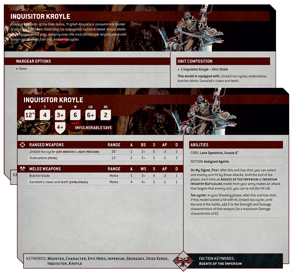 The big potential pivot point for Kroyle is what happens after shooting something - his special ability, On My Signal, Fire, provides full Hit re-rolls to AGENTS OF THE IMPERIUM and IMPERIUM INFANTRY BATTLELINE units for the rest of the phase (not turn, sorry Custodes) after hit connects with a target. This obviously makes him an instant, slam dunk auto-take in the Imperialis Fleet Imperial Agents builds that have made a few waves recently, but does anything else get enough value there?