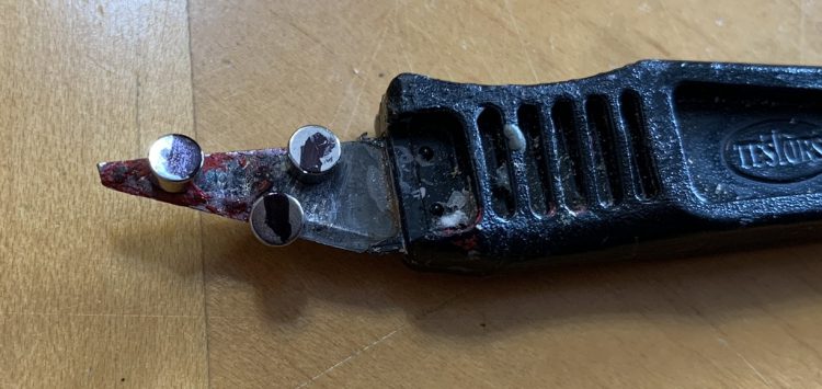 You’re all set - you have your magnet and you have your hole and a little dab of glue. How do you put the magnet into the hole? With something ferrous of course! I have an old hobby knife that couldn’t cut Jell-O on it’s best day, and I use that to position my magnet and push it into the hole. But what you should make sure you also have handy is something NOT ferrous, like a plastic rod or a coffee stirrer or something, to hold the magnet in place in the hole while you pull your hobby knife away. I mean, you could wait until the glue dries enough that its bond is stronger than the attraction of the magnet to your knife but that might be a while. And don’t use your finger to hold it in place unless you want the magnet glued to your finger and then you have another whole set of problems. If you want to get really fancy, you can pick yourself up a set of ceramic tweezers.These have been popularised somewhat by people in the vaping hobby and they allow you manipulate the magnet without it being attracted to the tool. I also learned super glue scrapes right off them, so they have that going for them too.