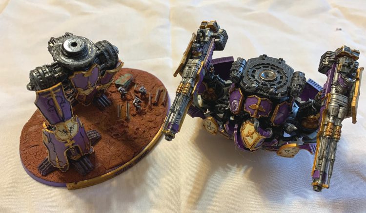 This Adeptus Titanicus Warlord has a pair of magnets at the waist so it can be taken apart for storage and transport. The arm and weapons are also magnetized for maximum indecisiveness.You can also use magnets to hold your minis down. Put one or two in the base and get a cookie sheet or cake pan and you have a super easy carry tray. Or if you’re designing a board with some scatter terrain that you don’t want to get bumped out of place, put a magnet on the bottom of the terrain piece and put another into the board itself (covered with some flocking maybe).