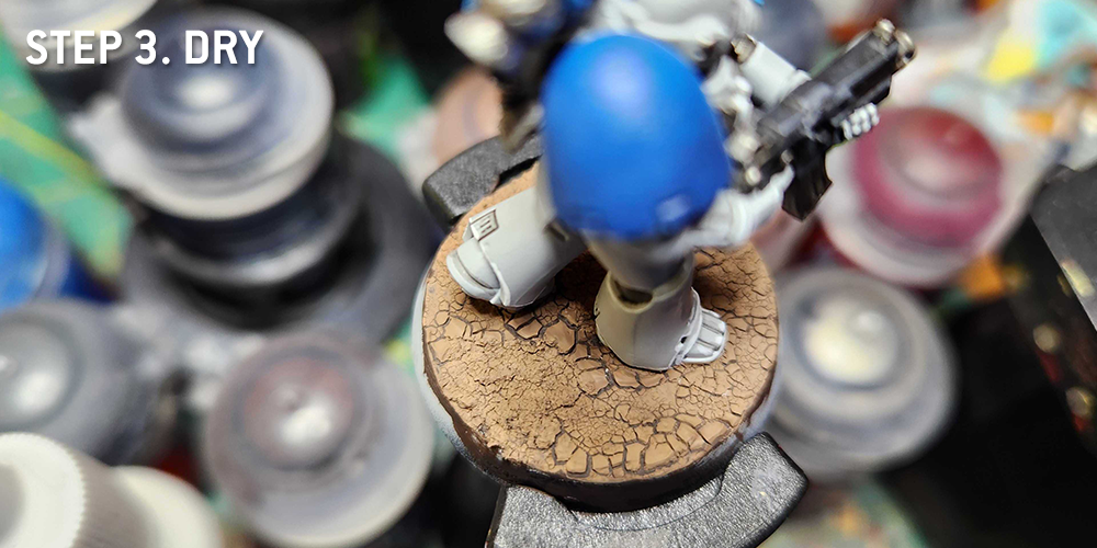 You have to wait for your paint to dry. Not much else to this step, but I wanted to show the difference between the two states so you can see what changes. You can also see where the Agrellan Badland puts in work on the lower left side of the base, offering an alternative texture.