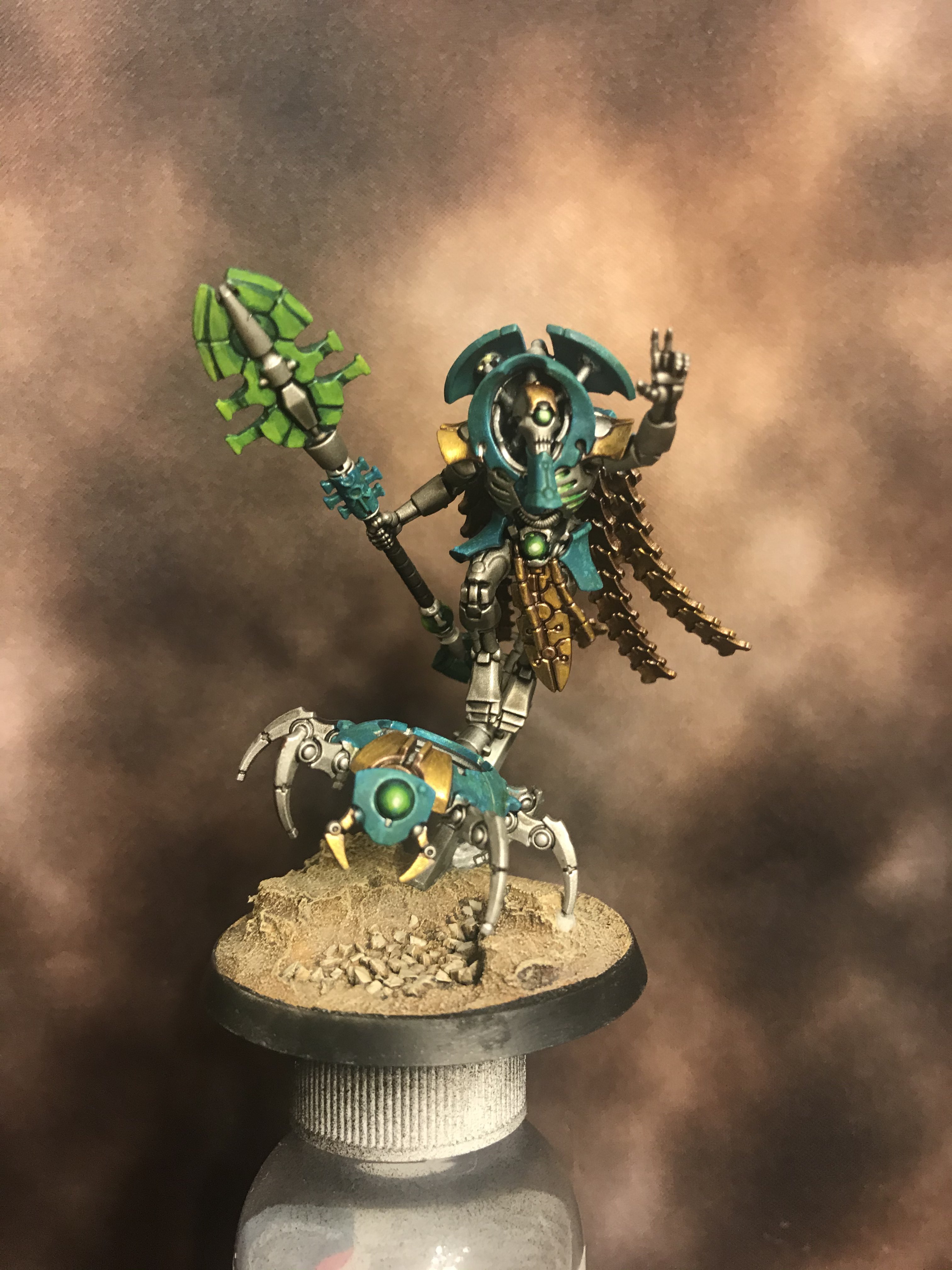 Credit: Zuul the CatTo me, Necrons are only as good as the ground they’re standing on and I really wanted my ground to stand out. I landed on a desert world, very much in the theme of the old Tomb King range from WHFB. Starting the bases is simple. Lay down some cork torn into various shapes and adhere to the bases with super glue. Then, use some Vallejo Ground Texture Acrylic base (I used Grey Sand, but any gritty texture will work.) While the paste is still wet, I sprinkled some crushed walnut shells into the lower recesses on the bases, pressing them into the paste a bit to make sure they stick.