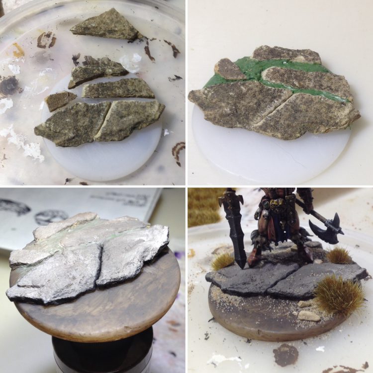 - Step 1 - Glue slate chips to the base. I'm using 1/8 to 1/4 slate gravel I bought on Amazon, but really any type of small rock that appeals to you will work here. Using regular superglue, I typically put two pieces of gravel on a 25mm base.